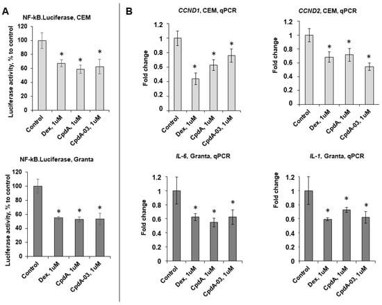 We analyzed GR TR function using the NF-kB.Luc reporter assay and found that CpdA-03 significantly reduced NF-kB activity. We also observed reduced luciferase activity in the presence of Dex and CpdA (Figure 5A), which is in line with our previous results [,,]. This finding was further confirmed by Q-PCR analysis demonstrating the downregulation of several endogenous genes such as cell cycle regulator cyclins CCND1/D2 [,,] in CEM cells as well as interleukins IL1 and IL6 involved in lymphoid cell survival in the Granta cell line (Figure 5B).