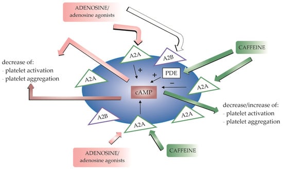 A schematic illustration of modulating effects of caffeine on blood platelet function. The adenosine receptors A2A and A2B are expressed in platelets. A2A receptors are predominantly involved in adenosine-stimulated platelet activation. Stimulation of adenosine receptors increases 3′,5′-cyclic adenosine monophosphate (cAMP) production, resulting in a decrease in platelet activation and aggregation. Caffeine affects platelet reactivity by antagonising adenosine receptors. The antiplatelet effect of caffeine can be enhanced by the presence of adenosine or other agonists. Caffeine may also exert its antiplatelet activity due to the inhibition of phosphodiesterase (PDE) activity, resulting in an increase in cAMP levels.