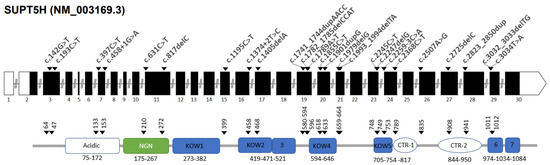 Schematic presentation of the SUPT5H gene. The white boxes are the untranslated regions, and the black boxes are the coding exons. Arrows indicate the position and HGVS annotation of the variants. The protein structure is shown below from left (N-terminus) to right (C-terminus). The functional domains are the acidic region, the NGN domain which interacts with Spt4, the five KOW domains (Kyrpides–Ouzounis–Woese domains), two C-terminal repeat domains (CTR-1 and CTR-2) which can be phosphorylated and, finally, two KOW domains (KOW6 and 7). The numbers below the domains indicate the amino acid (a.a.) positions in the protein chain and the arrows correspond with the arrows in the upper graph, indicating the a.a. position of each variant.