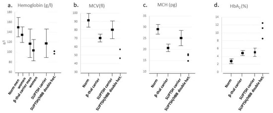 (a). Mean and 95% range of red cell indices for reference values from Dacie and Lewis, Practical Haematology 12th ed. [32], β-thalassemia carriers from Weatherall and Clegg, The Thalassemia Syndromes 4th ed. (1), SUPT5H carriers and double heterozygous carriers of SUPT5H and HBB variants (Table S1). (a). Hb (g/L) mean ± 2SD for reference group of men is 150 ± 20 g/L and that for women is 135 ± 15 g/L; Hb (g/L) mean ± 2SD for SUPT5H carriers is 119.5 g/L (91–149 g/L), which overlaps largely with the Hb of β-thalassemia carriers (men, 118 ± 15 g/L, and women, 108 ± 9.0 g/L). Mean Hb level of double heterozygote β-thalassemia and SUPT5H carriers is 98 g/L (SD = 2.89). (b). Mean MCV of reference men and women is 92 ± 9 femtoliter; the MCV of SUPT5H carriers is 79 femtoliter (69–91); the MCV of β-thalassemia carriers is 70.5 + 4.2 fl. The mean MCV of double heterozygote β-thalassemia and SUPT5H carriers is 53.3 femtoliter (SD = 6.35). (c). Mean MCH of reference is 29.5 ± 2.5 picogram, that of β-thalassemia carriers is 21.5 ± 1.3 picogram and that of SUPT5H carriers is 25.60 picogram (21.6–27.4). Mean MCH of double heterozygote β-thalassemia and SUPT5H carriers is 16.6 (SD = 1.42). (d). Mean HbA2 percentage for reference group is 2.2–3.5, mean HbA2% of SUPT5H carriers is 5.2% (3.6–6.4), and mean HbA2% of β carriers is 4.9 ± 0.5%. Mean of HbA2% for double heterozygote β-thalassemia and SUPT5H carriers is 10.67% (SD = 1.99).