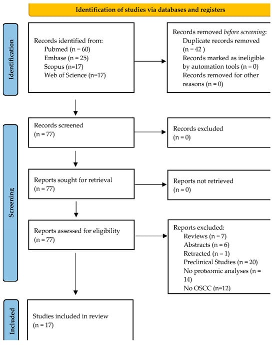 Chicago/Turabian StylePomella, Silvia, Ombretta Melaiu, Loredana Cifaldi, Roberto Bei, Marco Gargari, Vincenzo Campanella, and Giovanni Barillari. 2024. "Biomarkers Identification in the Microenvironment of Oral Squamous Cell Carcinoma: A Systematic Review of Proteomic Studies" International Journal of Molecular Sciences 25, no. 16: 8929. https://doi.org/10.3390/ijms25168929