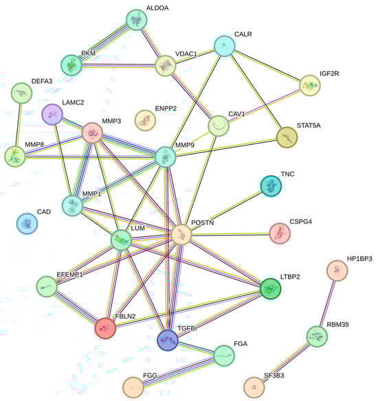| GO:0031012 | Extracellular matrix | 1.7 × 10−16 | MMP-8, LTBP2, LAMC2, TNC, LUM, 3, CSPG4, PKM, CALR, MMP-1, FGG, MMP-9, POSTN, EFEMP1, FBLN2, TGFBI, FGA |