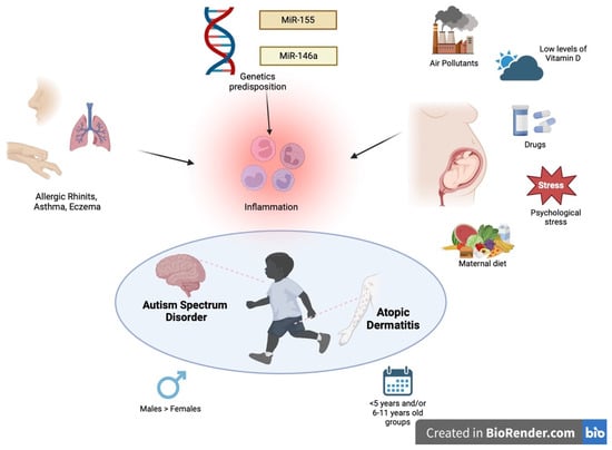 Given that the brain and epidermis share the same embryologic origin, Shin et al. hypothesized that both tissues are susceptible to common insults; thus, neurotoxins that cause ASD should also attack the epidermis. In addition, pro-inflammatory cytokines derived from the stimulation of the neonatal skin by insults could traverse the infant’s immature blood–brain barrier, initiating or amplifying neuroinflammation []. Therefore, in these multifactorial diseases, exposure to environmental factors can have different effects depending on the genetic background. Some gene variants in ASD have been found to confer vulnerability to certain environmental stressors []. Environmental exposure may also play a role in AD through epigenetic alterations, including microRNA and DNA methylation, modulating transcript levels of genes involved in epidermal differentiation and innate immunity [].