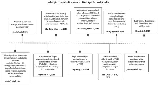 The timeline of research on the link between atopic comorbidities and autism spectrum disorders [,,,,,,,,,].
