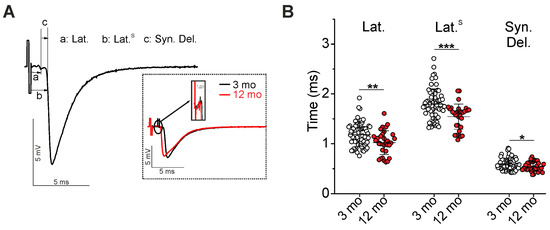 Measurements of latency and synaptic delay. (A) Typical extracellular recording, including artifact, AP, and EPP, is shown. Intervals corresponding to latencies (Lat. and Lat.S) and synaptic delay (Syn. Del.) are denoted as a, b, and c, respectively. Insert, the representative recordings from NMJs of 3- and 12-month-old mice (3 mo and 12 mo). (B) Quantification of latencies and synaptic delay. Data are represented as mean ± standard deviation (SD). n = 64 and 33 for 3 and 12 months. * p < 0.05, ** p < 0.01 *** p < 0.001 by Mann–Whitney U-test between groups.