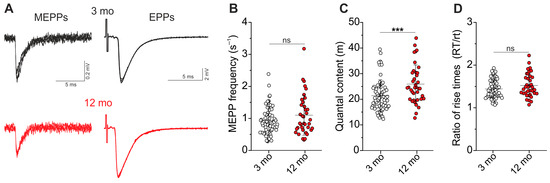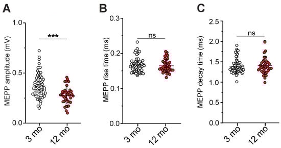 Parameters of miniature postsynaptic responses. (A) Amplitude, (B) rise time, and (C) decay time of MEPPs. n = 68 and 38 for 3 and 12 months. Data are represented as mean ± SD. *** p < 0.001 by Mann–Whitney U-test between groups; ns—non-significant.
