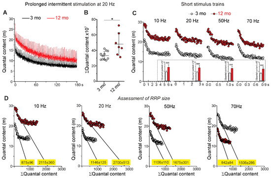 Then, we tested neurotransmitter release in response to shot trains (consisting of 63 stimuli) at 10, 20, 50, and 70 Hz. The stimulus trains were divided by 10 s rest periods (Figure 4C). At all stimulation frequencies used, the total amount of ACh quanta released was significantly higher (by 53 ± 26%, p < 0.001 at 10 Hz; by 55 ± 29%, p < 0.001 at 20 Hz; by 61 ± 29%, p < 0.001 at 50 Hz; and by 62 ± 30%, p < 0.001 at 70 Hz) in 12- (n = 7) vs. 3-month-old (n = 11) mice (Figure 4C). Also, at all frequencies of stimulation, the quantal content decreased rapidly from an initial value to a steady-state level (plateau). The initial decrease in quantal content mainly reflects the depletion of the readily releasable pool (RRP). Assuming a “sequential model” of synaptic vesicle pool involvement in neurotransmitter release [44], RRP size can be roughly estimated by plotting quantal content (y-axis) against cumulative quantal content (x-axis) and drawing a straight line through the decay phase; its intercept with x-axis gives an estimate of the approximate RRP size [45,46]. This evaluation, performed at 10, 20, 50, and 70 Hz stimulus trains, showed that the size of RRP was approximately two times more (p < 0.001) in 12- vs. 3-month-old mice (Figure 4D). Particularly, RRP size was ~1000 and 2000 quanta in 3 and 12 months, respectively. This estimation is close to previous morphological and functional observations that predicted the size of RRP to be about 1700 vesicles in adult mouse levator auris muscle [45,47].