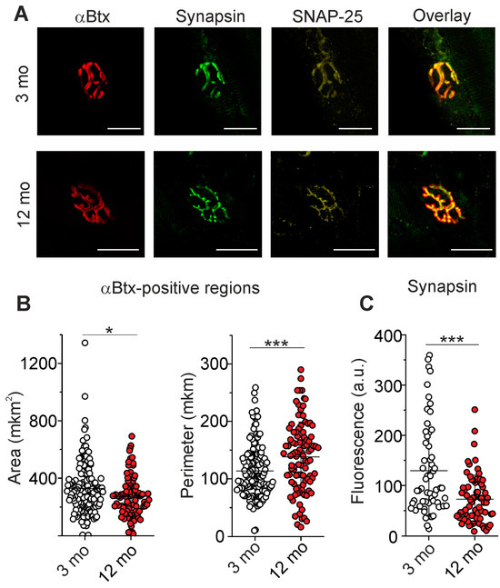 Labeling of postsynaptic and presynaptic components of NMJs. (A) The representative fluorescence images of NMJs, where postsynaptic nAChRs and presynaptic proteins (synapsin 1 and anti-SNAP-25) were labeled with αBtx and specific antibodies, respectively. Scale bars—25 µm. (B) Estimation of αBtx-positive area and perimeter. (C) Quantification of synapsin 1 immunofluorescence. Data are represented as mean ± SD; 143 NMJs from n = 7 (3 months) and 102 NMJ from n = 5 (12 months) were analyzed. * p < 0.05 and *** p < 0.001 by Mann–Whitney U-test between groups.
