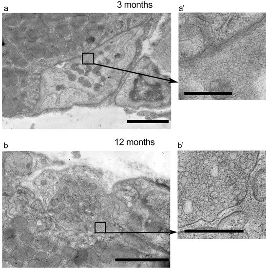 First, cross-sections of the NMJ regions (11 regions from 3 mice in each group) were analyzed in 3- and 12-month-old mice (Figure 6). The area of presynaptic terminal cross sections (3 vs. 12 months: 10.5 ± 5.1 μm2 vs. 11.6 ± 5.2 μm2) and the number of presynaptic mitochondria (19 ± 7 vs. 18 ± 6) were similar in both groups (Figure S2A,B), whereas synaptic vesicles were more diffusely distributed in axons of 12- vs. 3-month-old mice. The number of synaptic vesicles per nerve terminal cross-section were similar in both groups (Figure S2C), but there was a tendency of the synaptic vesicle distribution to decrease in density (208 ± 54 and 180 ± 57 per μm2 in 3 and 12 months, respectively; p = 0.189) in middle-aged mice (Figure S2D). The postsynaptic area looked noticeably more compact in older mice (Figure 6).