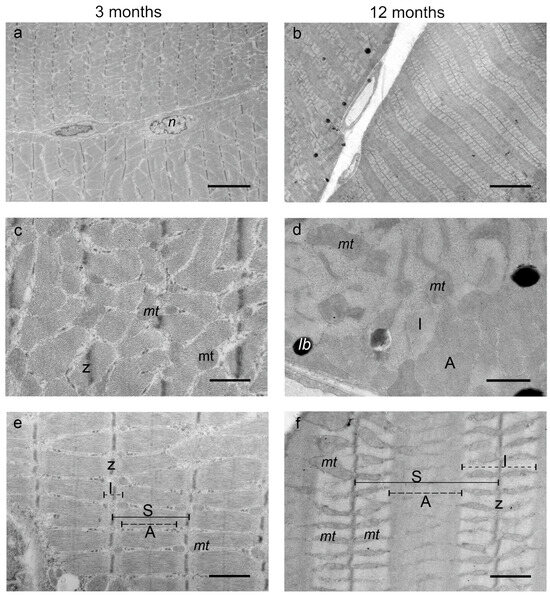 Ultrastructure of DIAm myofibrils of 3-month-old and 12-month-old mice. TEM images: (a,b) general view of muscle fiber bundles; (c,d) cross-section of myofibrils; (e,f) longitudinal section of myofibrils, sarcomere structure. Scale bars—5 µm (a,b) and 1 µm other microphotographs. Abbreviations: A—A-band, I—I-band, lb—lipid body, mt—mitochondria, n—nucleus, S—sarcomere, Z—Z-line.