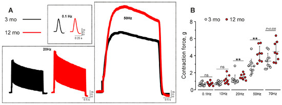 Muscle contractions evoked by nerve activation. (A) Representative traces of contractile responses to low- (0.1 Hz), moderate- (20 Hz), and high- (70 Hz) frequency stimulation in 3- and 12-month-old mice. (B) Quantification of maximal contraction force elicited by phrenic nerve stimulation at 0.1, 10, 20, 50, and 70 Hz. Data are represented as mean ± SD. n = 11 and 8 for 3 and 12 months. ns—non-significant and ** p < 0.01 by Mann–Whitney U-test between groups.