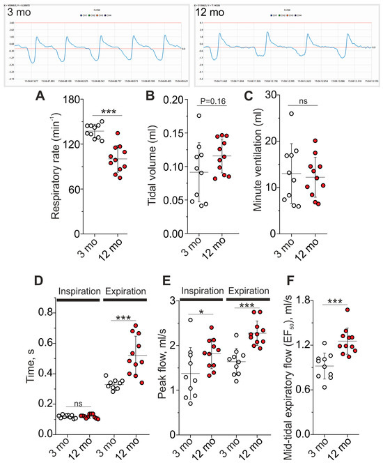 Whole-body plethysmography of 3- and 12-month-old mice. Top, the representative recordings. Quantification of respiratory rate (A), tidal volume (B), and minute ventilation (C) are shown. (D–F) Graphs show the kinetic parameters of breathing: inspiratory and expiratory time (D), peak inspiratory and expiratory flows (E), and mid-tidal expiratory flow or EF50 (F). Data are represented as mean ± SD. n = 10 and 11 for 3 and 12 months. * p < 0.05 and *** p < 0.001 by Mann–Whitney U-test between groups; ns, non-significant.