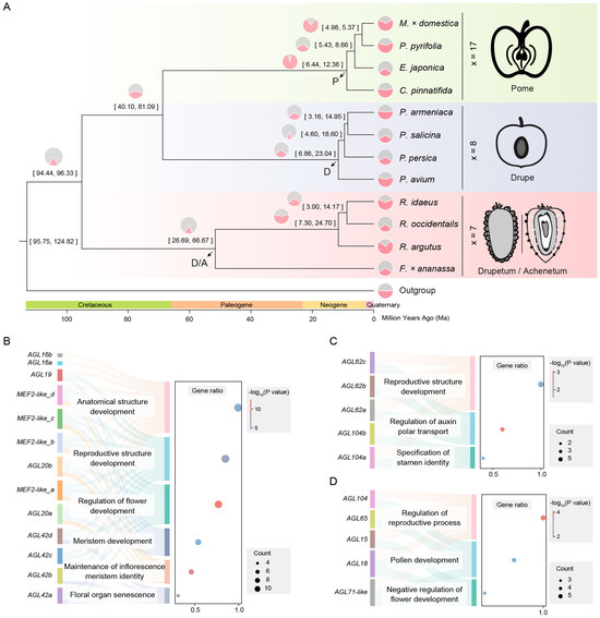 The crown age of the Rosaceae family is estimated to be 94.46–96.36 million years (Ma) [14]. Combined with phylogenetic analysis, we estimate that Maleae and Prunus diverged between 40.10 and 81.09 Ma, and the most recent common ancestor (MRCA) of Maleae emerged between 6.44 and 12.36 Ma. The MRCA of Prunus emerged between 6.86 and 23.04 Ma, and the MRCA of Rosoideae emerged between 26.69 and 66.67 Ma (Figure 1A). We define the MRCA of Maleae as the P (pome) node based on the type of fruit, the MRCA of Prunus as the D (drupe) node, and the MRCA of Rosoideae as the D/A (drupeum/achenetum) node (Figure 1A).