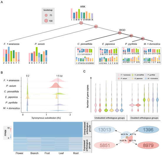 Chromosome karyotype and gene evolution after WGD in Rosaceae. (A) Evolutionary scenarios of chromosome karyotype changes between the ARK and F. × ananassa, P. avium, C. pinnatifida, E. japonica, P. pyrifolia, and M. × domestica. (B) Ks peaks of homologous genes in F. × ananassa, P. avium, C. pinnatifida, E. japonica, P. pyrifolia, and M. × domestica. A Ks value of 1.5 corresponds to the γ event that occurred in the common ancestor of core eudicots, about 117 ± 1 Ma. The peak at Ks = 0.2 corresponds to the recent WGD event, which occurred at approximately 14.69 Ma. (C) Preservation and expression of gene copies after WGD. All genes are divided into four orthologous groups: those with an undoubled number of genes not expressed in tissue, those with an undoubled number of genes expressed in tissue, those with a doubled number of genes not expressed in tissue, and those with a doubled number of genes expressed in tissue.
