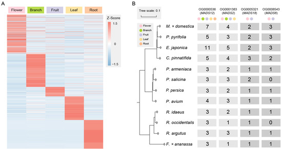 Exploring tissue-specific expressed genes and MADS-gene orthologous groups. (A) Tissue-specific expressed genes in doubled orthologous groups include those expressed in tissue types such as flowers, branches, fruits, leaves, and roots. (B) There are four orthologous groups of MADS-box genes. The number of gene copies shows a fold relationship between Maleae and other species in Rosaceae. Some gene copies from MADS12 and MADS2 are expressed in multiple tissue types, while the gene copies from MADS18 and MADS6 are only expressed in the flowers and fruits.