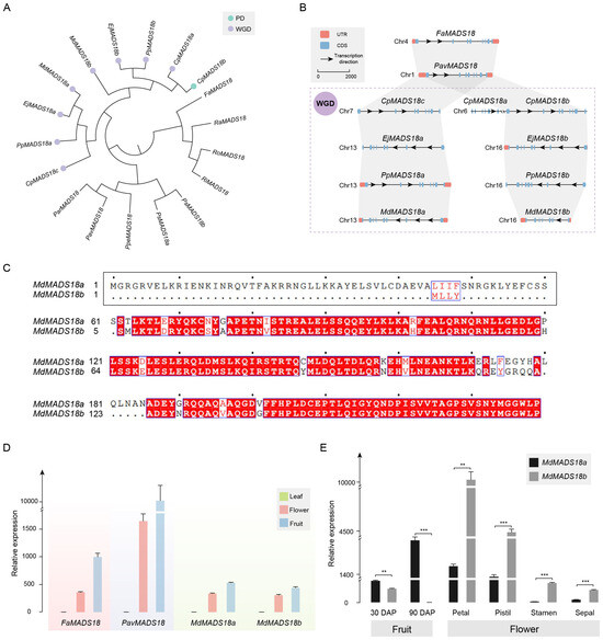 Analysis of MADS18 orthologous group. (A) Phylogenetic analysis of MADS18 gene copies in Rosaceae. The duplication events are classified into WGD or segmental (WGD) and proximal duplications (PD). (B) In the collinearity analysis of MADS18 gene copies, rectangles represent gene structures, arrows indicate transcription directions, the reference line represents a length of 2000 bp, and the purple dashed box represents species that have undergone WGD. (C) Analysis of protein sequence similarity between MdMADS18a and MdMADS18b; the N-terminus of MdMADS18b specifically lacks 60 amino acids. The black border represents the sequence with a specific deletion at the beginning of MdMADS18a in this article. The blue border and red font indicate that more than 70% of the amino acids at this position have similar physico-chemical properties. The red background with white font indicates that the amino acids at this position are highly conserved. The black font represents standard amino acids, and the center point represents the sequence position, with each point indicating the next 10 amino acids. (D) Relative expression of the MADS18 gene copies in the leaf, flower, and fruit by qRT-PCR. (E) Relative expression of MdMADS18a and MdMADS18b genes in fruits at different developmental stages and in different flower organs. Statistical significance was determined using Student’s t-test, where ** indicates p < 0.01, and *** indicates p < 0.001.