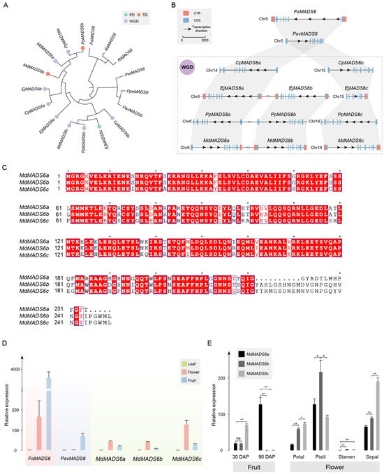 Analysis of MADS6 orthologous group. (A) Phylogenetic analysis of MADS6 gene copies in Rosaceae. The duplication events are classified into WGD or segmental (WGD), tandem (TD), and proximal duplications (PD). (B) In the collinearity analysis of MADS6 gene copies, rectangles represent gene structures, arrows indicate transcription directions, the reference line represents a length of 2000 bp, and the purple dashed box represents species that have undergone WGD. (C) Analysis of protein sequence similarity among MdMADS6a, MdMADS6b, and MdMADS6c. Compared to MdMADS6b, MdMADS6a has specifically deleted or mutated 27 amino acids at the C-terminus, while MdMADS6c has a specific mutation of 41 amino acids. The blue border and red font indicate that more than 70% of the amino acids at this position have similar physico-chemical properties. The red background with white font indicates that the amino acids at this position are highly conserved. The black font represents standard amino acids, and the center point represents the sequence position, with each point indicating the next 10 amino acids. (D) Relative expression of the MdMADS6 gene copies in the leaf, flower, and fruit by qRT-PCR. (E) Relative expression of MdMADS6a and MdMADS6b genes in fruits at different developmental stages and in different flower organs. Statistical significance was determined using Student’s t-test, where * indicates p < 0.05 and ** indicates p < 0.01.