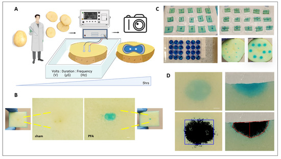 Characterization of in vitro vegetal model to test pulse parameters. (A) Workflow schematic using solanum tuberosum slices to test pulse parameters. (B) Representative slices with sham control and PFA-treated lesions. Scale bar 1 mm. (C) Dye staining of slices in different formats and XY and Z lesions. (D) Digitization of slices for image analysis (red and blue lines indicate lesion boundary and dimension) and lesion quantification.