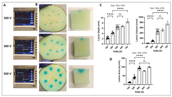 Increasing voltage significantly increases lesion size. (A) Oscilloscope recordings with biphasic square waveform with increasing voltage. (B) Representative slices post PFA treatment with 100, 300, and 500 V in the XY and Z plane. (C,D) Quantification of lesion characteristics including depth, volume, and area. Data are mean ± SEM. n ≥ 3. **** p < 0.0001, ns not significant.
