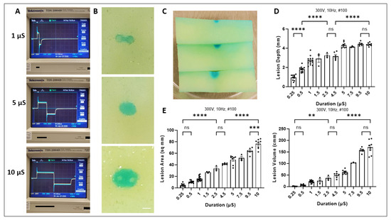 Effects of duration on ablation outcome. (A) Oscilloscope recordings with biphasic square waveform with increasing phase duration. Representative slices post PFA treatment with 1, 5, and 10 µS in XY and Z plane (B,C) Scale Bar 1 mm. Quantification of lesion characteristics including depth, volume, and area (D,E). Data are mean ± SEM. n ≥ 3. ** p < 0.01, *** p < 0.001, **** p < 0.0001, ns not significant.