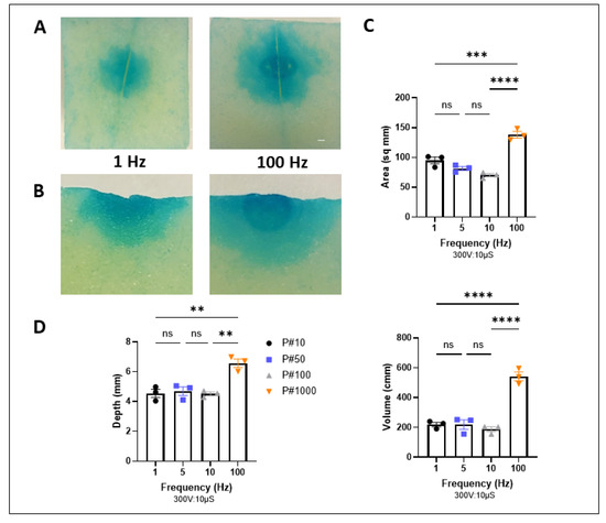 Frequency modulation with constant duration. (A) Representative slices post PFA treatment at 1 and 100 Hz in XY plane. Scale Bar 1 mm. (B) Slices post PFA treatment at 1 and 100 Hz in Z plane. Quantification of lesion characteristics including depth, volume, and area with increasing frequency and pulse number (C,D). Data are mean ± SEM. n ≥ 3. ** p < 0.01, *** p < 0.001, **** p < 0.0001, ns not significant.