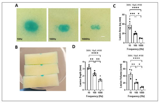 Along with the above-tested parameters, we investigated the effect of increasing the frequency and pulse number on lesion size. With a constant total pulse duration, major changes in frequency showed increased lesion sizes (Figure 4A,B). Large increase in repetition rate from 1 to 100 Hz increased lesion boundaries, but subtle changes in frequency with constant total duration did not seem to significantly alter ablation outcome (Figure 4C,D and Figure S2D).