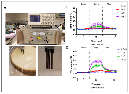 Temperature changes resulting from PFA treatments were monitored using a non-metallic optic STB probe (catalog # L-00-14500-01, Advanced Energy Industries, Denver, CO, USA) with a response time of 0.25 s, sampling rate of 0.02 s, and diameter of 0.5 mm. The STB probe was positioned adjacent and parallel to one of the electrodes. The probe’s performance was evaluated both with and without slices and was exposed to various temperatures, as detailed in Figure S3. Temperature measurements were taken before, during, and after treatments to capture the complete temperature profile, including the rate of increase and decrease in temperature.