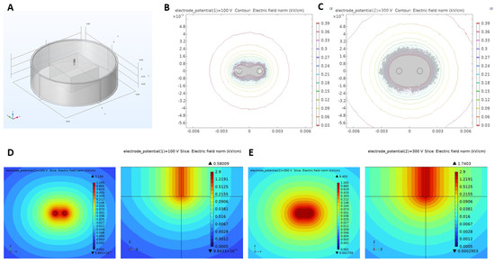 In silico modeling and EF distribution. (A) 3D illustration of finite-element simulation. (B,C) Stained slices of lesions obtained after PFA treatments of 100 and 500 V superimposed on electric field isolines. (D,E) Electric field distribution simulations in both XY and Z planes for PFA treatments of 100 and 300 V.