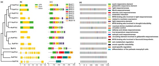 Phylogenetic relationship (a), gene structure (b), conserved motifs (c), and cis-acting elements in promoters (d) of IPT genes in radish. The yellow rectangles and black lines represent exons and introns of genes, respectively, and their lengths are presented proportionally. The 10 conserved motifs and 21 cis-acting elements are indicated in different colors.