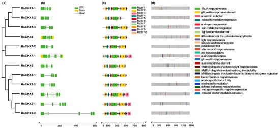 Phylogenetic relationship (a), gene structure (b), conserved motifs (c), and cis-acting elements in promoters (d) of CKX genes in radish. The green rectangles and black lines represent exons and introns of genes, respectively, and their lengths are presented proportionally. The 10 conserved motifs and 25 cis-acting elements are indicated in different colors.
