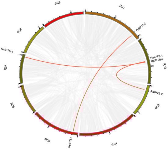 Collinearity analysis of RsIPT genes among radish chromosomes. Different chromosomes are indicated with corresponding number and colors in different regions of circle. The genes connected by the red line are segmental duplication pairs.