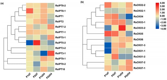 Expression profiles of (a) RsIPT and (b) RsCKX genes during different infection periods after inoculation with Plasmodiophora brassicae in susceptible (P1, YS-472) and resistant varieties (P2, YR-456). P1d7: susceptible variety 7 days after inoculation/corresponding control with no infection; P2d7: resistant variety 7 days after inoculation/corresponding control with no infection; P1d34: susceptible variety 34 days after inoculation/corresponding control with no infection; P2d34: resistant variety 34 days after inoculation/corresponding control with no infection. Color scale indicates the relative expression of genes by log2 transformation compared with the controls.