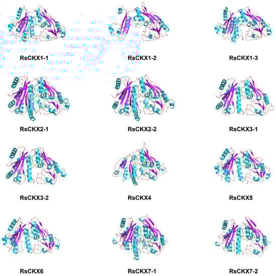 The 3D structure of these proteins was further developed. In terms of the result of PSI-BLAST, the sequence identity between RsCKX proteins and their target templates, which were searched from the PDB database, was greater than 30%. Therefore, the 3D structure of RsCKX proteins was predicted based on the homology modeling method. As shown in Figure 11 by the 3D structure of RsCKX proteins, the secondary structure contents of the modeled 3D structure were generally consistent with those above, consisting mainly of random coil, alpha helix, and extended strand. Further analysis revealed that the RMSD value of alignment between different 3D structures of RsCKX proteins was less than 1 Å, suggesting that all RsCKX proteins had similar 3D structures (Table 5). Moreover, the RMSD values between the proteins belonging to the same group were closer to 0 than the proteins belonging to different groups. Thus, the 3D structure of the RsCKX proteins that were classified into the same group was more similar.