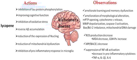 The pro-inflammatory response in microglia induced by Aβ, which plays a role in the pathogenesis of AD, is also inhibited by lycopene. The neuroprotective effects of lycopene are mediated by the activation of microglia, the adenosine 5′-monophosphate-activated protein kinase (AMPK), peroxisome proliferator-activated receptor γ (PPARγ), and phosphatidylinositol-4,5-bisphosphate 3-kinase (PI3K)/protein kinase B (Akt) signaling [,]. Liu et al. [] conducted a study in rats that showed that lycopene had a protective effect on β-amyloid-induced inflammatory responses in the choroid plexus. After intragastric lycopene supplementation for 21 days (5 mg/kg), cognitive functions improved in the study group and the cytokine profiles of tumor necrosis factor-α (TNF-α), interleukin-1β (IL-1β), and IL-6 were reduced in serum, and the inhibition of nuclear factor-κB (NF-κB) p65 and TLR4 activation in the choroid plexus occurred. The inhibition of the inflammatory response in the CNS and repair of learning and memory deficits as a result of 2 weeks of lycopene treatment was demonstrated in an in vivo study using rats exposed to Aβ 1-42 [].