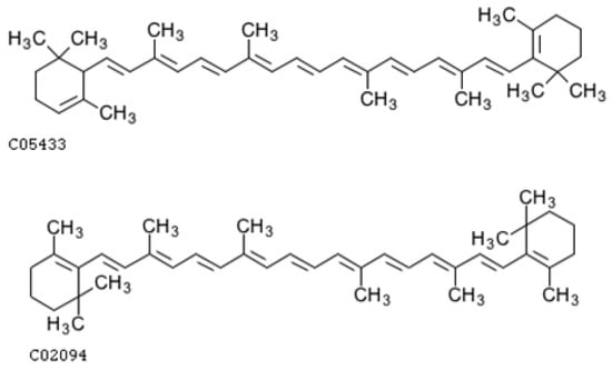 Chemical structures of α-carotene: KEGG Compound: C05433 (top), β-carotene-KEGG compound: C02094 (bottom) [].