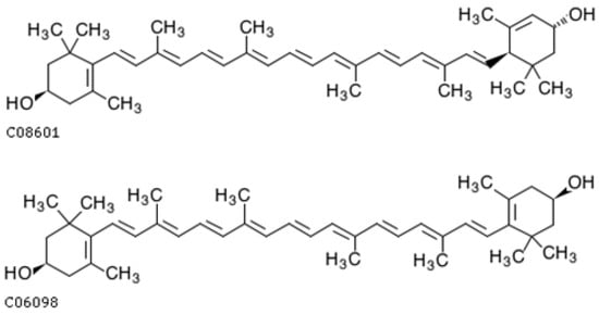Chemical structures of lutein: KEGG compound: C08601 (top), and zeaxathin KEGG compound: C06098 (bottom) [].