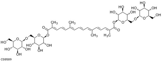 - Guo, Z.; Li, M.; Li, X.; Wang, P.; Wang, W.; Du, W.; Yang, Z.; Chen, S.; Wu, D.; Tian, X. Crocetin: A Systematic Review. Front. Pharmacol. 2022, 12, 3920. [Google Scholar] [CrossRef] [PubMed]