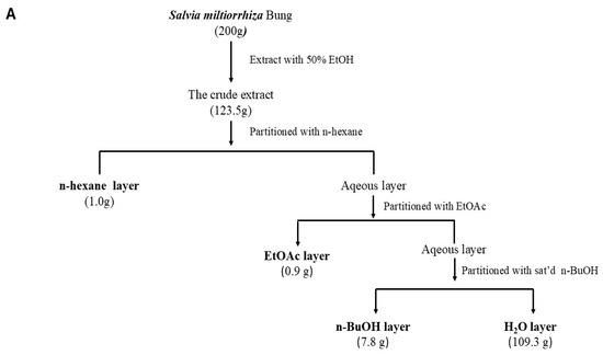 Dried roots of Salvia miltiorrhiza were purchased from Chuang Song-Zong Pharma- ceutical Co., Kaohsiung, Taiwan. The preparation and extraction procedures are illustrated in Figure 1A. Slices of S. miltiorrhiza (200 g) were pulverized and refluxed with 50% ethanol. After evaporation of the solvent, the crude extract was further partitioned with n-hexane (n-hexane), ethyl acetate (EtOAc), and n-butanol (n-BuOH). All of the liquid extracts were concentrated using a rotary evaporator (Yamato Scientific Co., Tokyo, Japan) until they were dry. Dried extracts were then dissolved in cell culture-grade DMSO (Sigma Aldrich Inc., St. Louis, MO, USA) to prepare a 20 mg/mL stock solution and stored at 4 °C. The S. miltiorrhiza extract was diluted with culture media to achieve the indicated final concentration in each experiment. DMSO, used as the vehicle control, was added in an equal amount and was less than 2.5‰ (v/v).