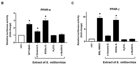 Several pieces of evidence suggest that PPARs play a critical role, especially the -α and -γ isoforms, against oxidative stress [27,28,29], inflammatory responses [10,28,30], and fibrotic injuries [29,30] in diabetic nephropathy. To identify the components of S. miltiorrhiza potentially modulating PPAR activity, we partition the crude extract into four main fractions (as illustrated in Figure 1A). A dual luciferase reporter assay was used to evaluate extracts stimulating PPAR-α or PPAR-γ transcriptional activity [31]. Renal mesangial cells were transiently transfected with two luciferase constructs, PPRE X3-TK-luc and PPRE-pNL1.3, and then treated with S. miltiorrhiza extracts or a specific PPAR-α agonist, WY14643, and potent PPAR-γ agonist, rosiglitazone, as positive controls for their respective receptors, for 24 h. The reporter assay showed that PPAR-α transcription was significantly elevated in the treatment of EtOAc and in the n-hexane layer of S. miltiorrhiza, while minimal or no effects were observed in n-BuOH and the water layer (Figure 1B). The reporter assay showed a significant increase in PPAR-α transcription with EtOAc or the n-hexane layer of S. miltiorrhiza, while minimal to no effect was observed with n-BuOH and the water layer. On the other hand, among all S. miltiorrhiza extracts, only the EtOAc layer significantly induced the transcriptional activity of PPAR-γ (Figure 1C). These results suggest that the EtOAc layer of S. miltiorrhiza exhibited a strong activity in stimulating PPAR-α and PPAR-γ transcriptional activity in renal mesangial cells.
