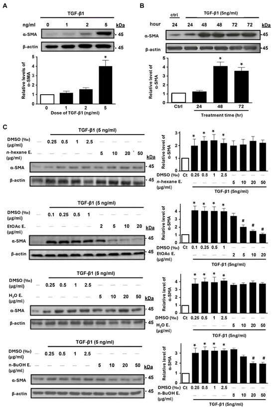 EtOAc extract of S. miltiorrhiza inhibits α-smooth muscle actin (α-SMA) up-regulation in TGF-β1-treated fibroblasts most effectively. (A) Effect of increasing TGF-β1 doses on the expression of α-SMA, a pivotal marker of myofibroblast activation, in NRK-49F cells. * p < 0.05 compared to normal controls. (B) Time-course effect of TGF-β1 (5 ng/mL) on the promotion of α-SMA activation in NRK-49F cells. * p < 0.05 versus normal controls for the indicated time points. (C) Western blot analysis of α-SMA expression in TGF-β1-stimulated NRK-49F cells co-cultured with different concentrations of S. miltiorrhiza extracts or the solvent control (dimethyl sulfoxide; DMSO) for 48 h. * p < 0.05 compared to the normal controls, # p < 0.05 versus DMSO-treated controls. Protein lysates from treated renal fibroblasts were analyzed for α-SMA expression by immunoblotting, followed by densitometric quantification. Data are presented as means ± SD (n = 3 for each experiment).