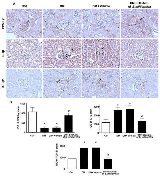 Next, we investigated the in vivo activity of the EtOAc extract of S. miltiorrhiza using STZ-induced diabetic mouse models. After administering the extract to STZ-induced mice for 12 weeks, renal tissues were examined for PPAR-γ, IL-1β, and TGF-β1 gene expression. Immunohistochemical analysis showed upregulated IL-1β and TGF-β1 levels in diabetic mice, accompanied by reduced PPAR-γ expression. These results suggest that the EtOAc extract of S. miltiorrhiza significantly attenuated the diabetes-induced alterations of PPAR-γ, IL-1β, and TGF-β1 (Figure 4).