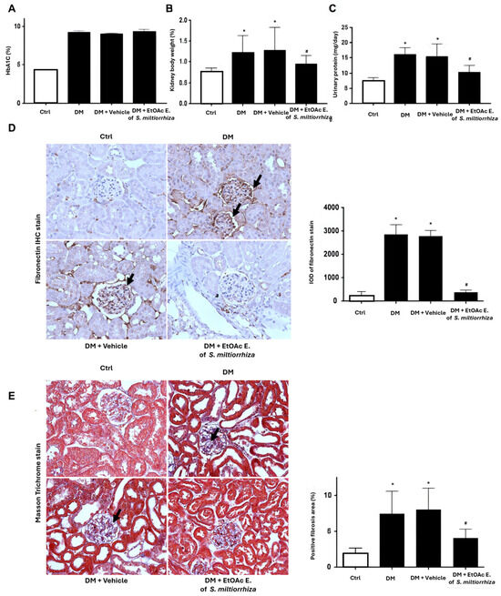 Treatment with the EtOAc extract from S. miltiorrhiza protects against diabetes-induced kidney injury. (A) Levels of glycated hemoglobin A1c (HbA1c), (B) kidney to total body weight ratio, and (C) daily excretion of urinary total protein in normal control, DM, vehicle-treated DM, and S. miltiorrhiza EtOAc extract-treated DM mice. (D) Representative IHC staining of fibronectin in renal sections from normal control, DM, and DM treated with vehicle or EtOAc extract of S. miltiorrhiza. (Arrow indicate areas of increased expression of fibronectin). The IOD of fibronectin-positive areas was analyzed, and data are presented as means ± SD. (E) The severity of fibrosis and extent of collagen deposition is evaluated by Masson’s trichrome staining (magnification × 400) (Arrow indicate areas of increased expression of fibronectin). The positive area of fibrosis is significantly diminished after treatment with S. miltiorrhiza EtOAc extract in DM mice. * p < 0.05 versus normal controls; # p versus STZ-induced DM mice (n = 6).