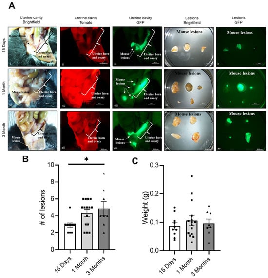 Progression of endometriosis using the Pgr cre/+ Rosa26 mT/mG mouse model: (A) Brightfield, Tomato red and GFP images of the uterine cavity of the mouse at 15 days, 1 month and 3 months after induction of endometriosis. Lesions collected from those animals are shown with brightfield and GFP. Scale bar: 5000 μm. (B) Comparison of the number of lesions. * p < 0.05 and (C) weight of the lesions over time. Mice at 15 days (n = 10), 1 month (n = 15) and 3 months (n = 8).