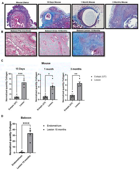 To gain insight into the progression of fibrosis over time in the mouse and baboon models, we performed Masson’s trichrome staining to quantify the extent of fibrosis in endometriotic lesions. In the mouse model, Masson’s trichrome staining revealed the deposition of collagen surrounding the lesion during the three time points (15-day, 1-month and 3-month lesions) (Figure 2A,C). In order to validate our findings from the mouse model in the baboon during the course of the disease, Masson’s trichrome staining confirmed an increase in the deposition of collagen in lesions at 15 months (Figure 2B,D). These observations showed that the extent of fibrosis is progressively increased in endometriotic lesions and eutopic endometrium in baboons with endometriosis (Figure 2B).