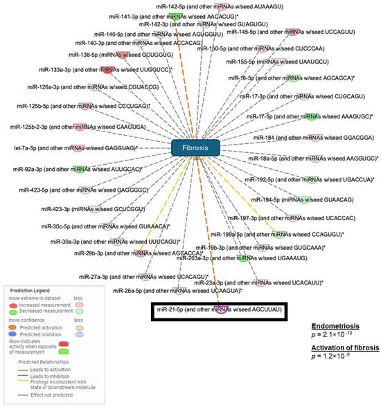 Based on the similarity of the induced and spontaneous disease, all samples were combined (n = 24), and we found that 304 of 579 miRNAs were DE (52%), with 150 increased in the ectopic lesions compared to the eutopic endometrium. Among the top DE miRNAs related to fibrosis, miR-21 was identified. The Ingenuity Pathway Analysis of the 304 DE miRNAs identified angiogenesis and organismal injury, including fibrosis, as the major functional alterations in the predicted gene networks. Ingenuity Pathway Analysis of DE miRNAs identified enrichment for associations with endometriosis (p = 2.1 × 10−10) and activation of fibrosis (p = 1.2 × 10−9) (Figure 3).
