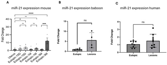miR-21 expression in mouse, baboon and human lesions: (A) mir-21 fold change comparing uterine lesions and matched eutopic lesions in mice at 15 days (n = 7), 1 month (n = 10) and 3 months (n = 9) with endometriosis; (B) baboons at 15 months after endometriosis induction (n = 4), (C) women (n = 9) with endometriosis. ns (not significant), * p < 0.05, *** p < 0.001 and **** p < 0.0001.