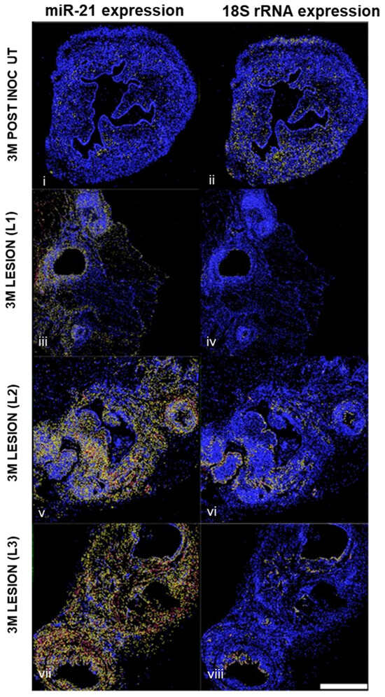 In situ hybridization of miR-21 expression and 18SrRNA expression in mouse uterus and lesions (n = 3). Staining intensity was displayed in blue, yellow or red depending on their low to high intensity. Scale bar: 500 μm.