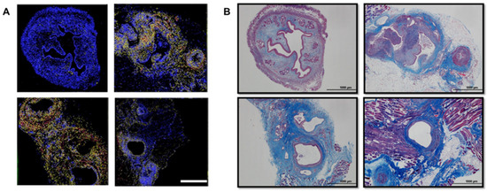 Masson’s trichrome staining was used for the detection of collagen fibers in tissues and to visualize the tissue structure. Paraffin-embedded tissue sections were deparaffinized in xylene and rinsed in absolute alcohol series. After a water rinse, the sections were immersed in Bouin’s Fluid overnight at room temperature. The tissue sections were then stained using the Trichrome One-Step Blue & Red Satin Kit Procedure (#KTTTRBPT StatLab/American Master Tech, McKinney, TX, USA) following the manufacturer’s instructions. The kit steps included the use of Modified Mayer’s Hematoxylin and One Step Trichome Stain followed by the dehydration of the tissue in absolute alcohol series and the final step of xylene before coverslipping the stained uterine tissues and lesions. ImageJ Image Analysis software (NIH, v 1.54f) was utilized to determine the quantification of collagen fibers [65].