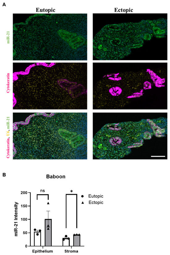 In situ hybridization of miR-21 in the baboon model: (A) The left panel shows the in situ hybridization of the eutopic endometrium of the baboon and the right panel shows an ectopic lesion. miR-21 is represented in green, cytokeratin in pink and U6 in yellow. (n = 3). Scale bar 300 px. (B) miR-21 quantification in eutopic and ectopic . ns (not significant), * p < 0.05.