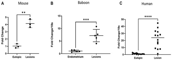 Expression of CTGF in (A) mouse, (B) baboon and (C) women with endometriosis. A significant increase in CTGF expression in lesions was evident in mouse (n = 3), baboon (n = 5) and women with endometriosis (n = 14). ** p < 0.01, *** p < 0.001 and **** p < 0.0001.